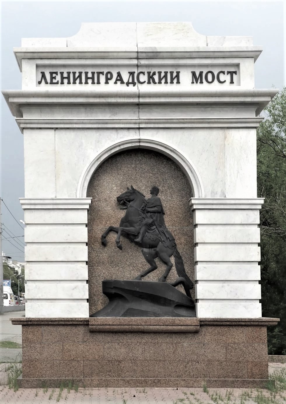 Внутри арки с надписью «Ленинградский мост» разместился барельеф Медного всадника (Петра Первого верхом на коне) из каслинского чугунного литья.