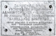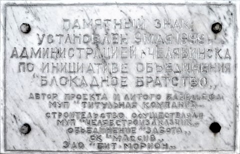 «Памятный знак установлен 9 мая 1999 г. Администрацией г. Челябинска по инициативе объединения «Блокадное братство».