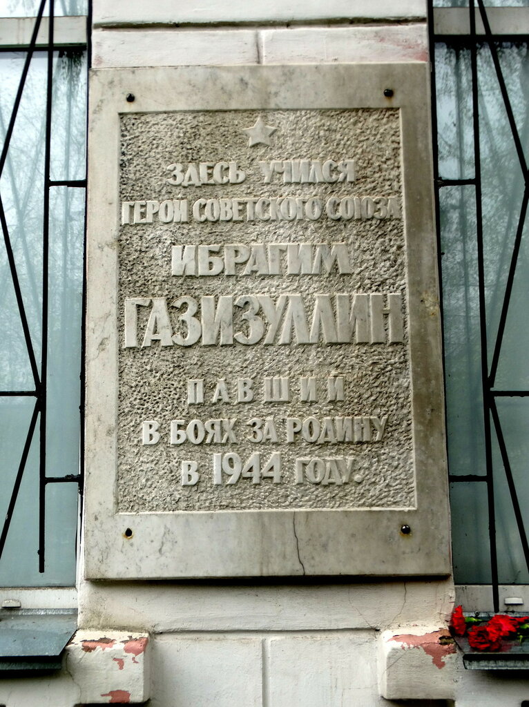 Памятник (стела) И.Г. Газизуллину установлен в 1988 г. возле здания школы № 58.