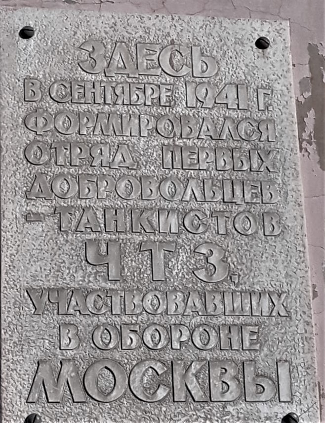 На здании Дворца культуры Челябинского тракторного завода (ЧТЗ) размещен Памятный знак с надписью «Здесь в сентябре 1941 г. формировался отряд первых добровольцев–танкистов ЧТЗ, участвовавших в обороне Москвы».